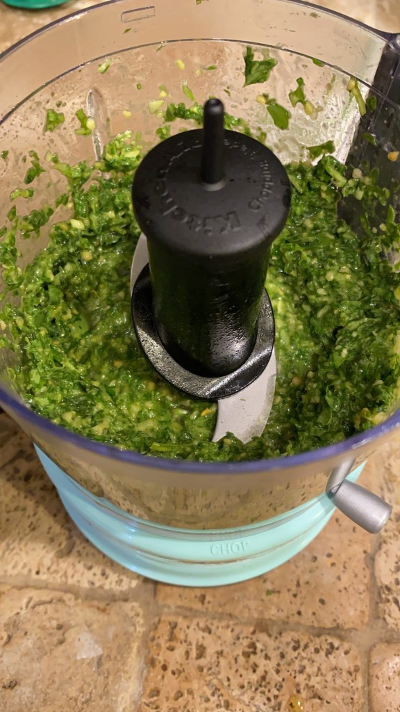 Pesto can also be frozen which is extremely helpful when I am in a time crunch or out of ideas for a meal. I prefer to spoon it into an ice tray and just pop them out as I need. The cubes are a great addition of flavor and defrost in no time. I love pesto because it is SO versatile. The basic pesto recipe is basil, garlic, olive oil, pine nuts, and parmesan cheese. I like to use whatever greens I have in the fridge that need to be used up. We are a big fan of arugula and spinach in lieu of the basil. It makes for a more peppery flavor versus sweet from the basil and quite honestly, most the time my basil plant is dead. I also try to really cut down the oil used in pesto because it is not always something my husband is eating. I use filtered water and lemon juice until I get the consistency I want, the taste is more bright and not as heavy with the olive oil, it’s a great substitution. That being said, if you’re not into dairy, you can omit the parm and use Nutritional Yeast, it’s a great product that taste nutty and gets the job done just as well as parmesan cheese.