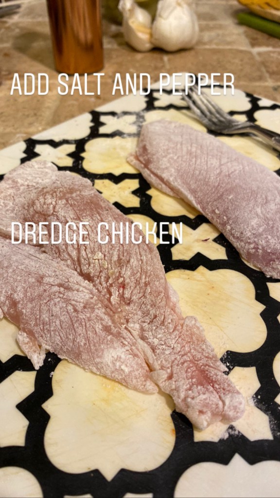In a large skillet, heat some butter and olive oil over medium high heat. In the mean-time, cut your chicken breast in half and season with salt and pepper. Place a couple tablespoons of flour on a plate or in a shallow dish and coat the chicken breast. Shake off the excess flour, this is dredging! Great for browning your chicken and keeping the meat tender.