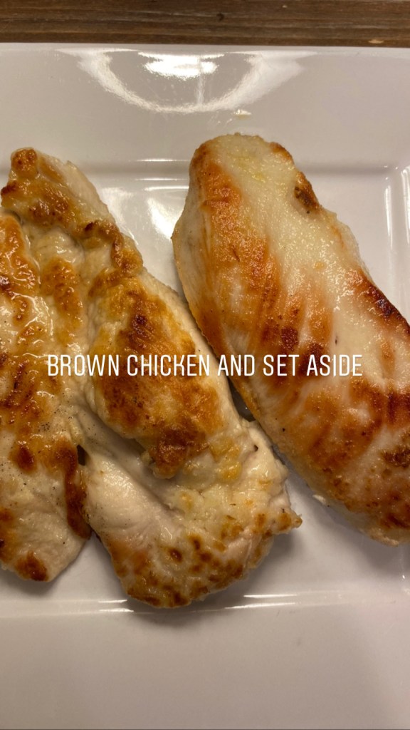 Add the chicken breast halves to the hot pan and brown on each side, about 3 mins depending on the thickness. Once browned and cooked through, place chicken on a plate to rest. Do not clean out the pan.