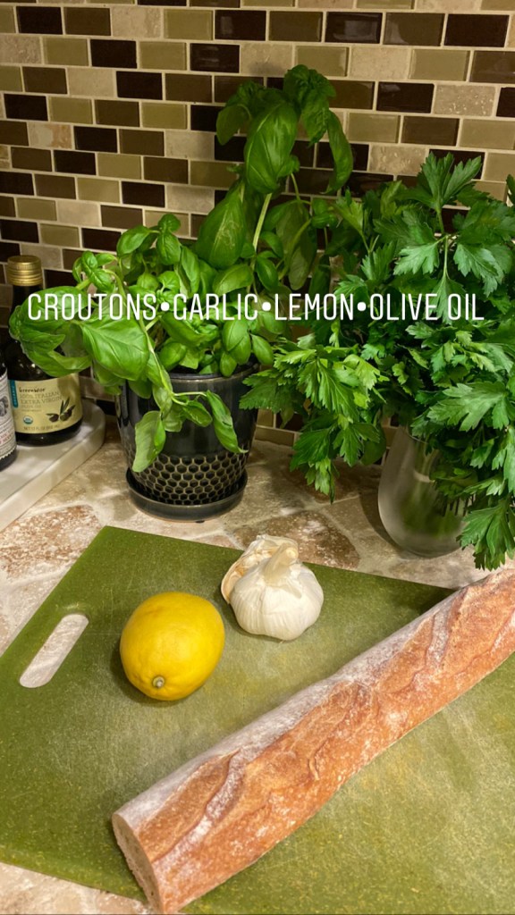 I simply tossed lemon juice, a clove of garlic, parsley, and olive oil with the bread cubes in a large bowl and spread them onto a sheet pan to bake until golden brown.