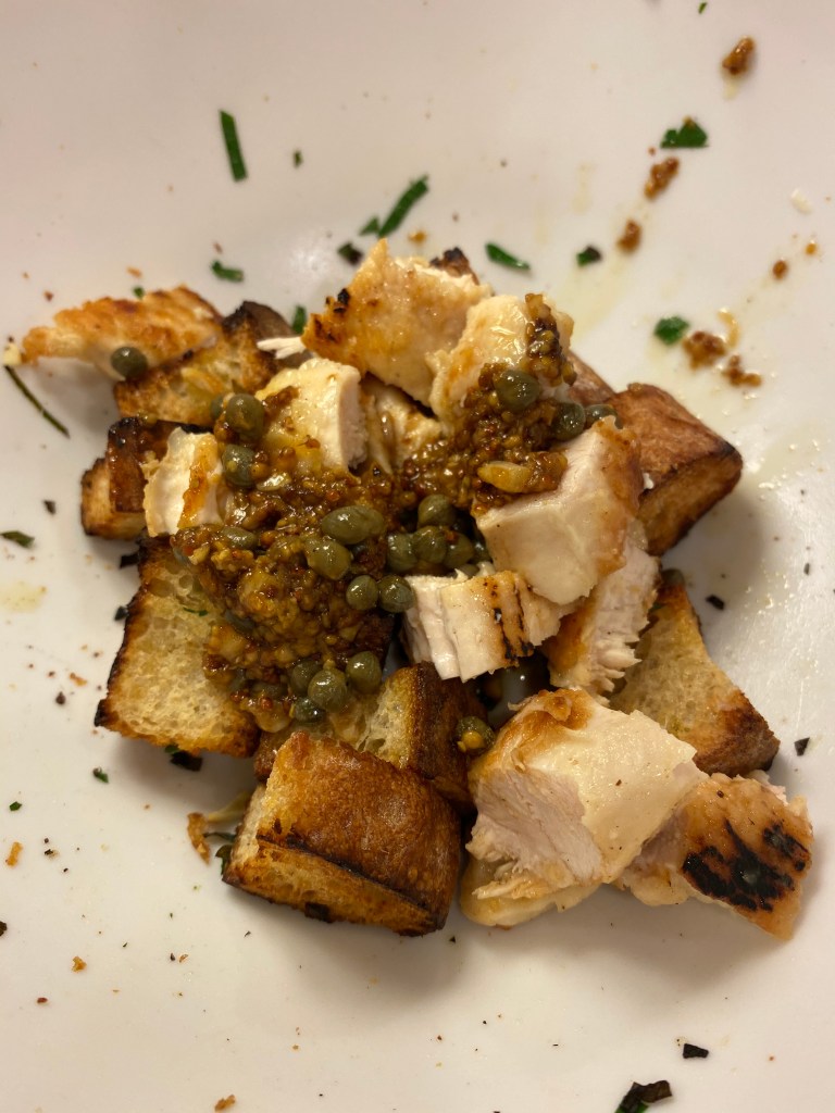 Lastly, I cut the chicken breasts into chunks and added them to the resting bowl of croutons and veggies. Scoop the warm caper vinaigrette into the bowl as well and gently toss all together. Top with your crispy prosciutto and there ya have it! A chicken saltimbocca milanese picatta PANZANELLA salad! Say that 5 times fast.