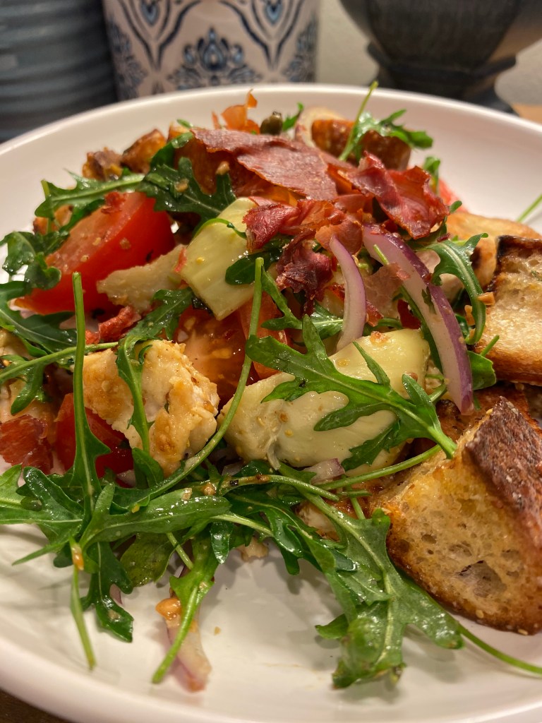 I used artichokes, tomatoes, red onion, and added some arugula (for the milanese idea). Most panzanella salads stick to the chunks of veggies and don’t add a lot of greens and lettuce. It is a BREAD salad.