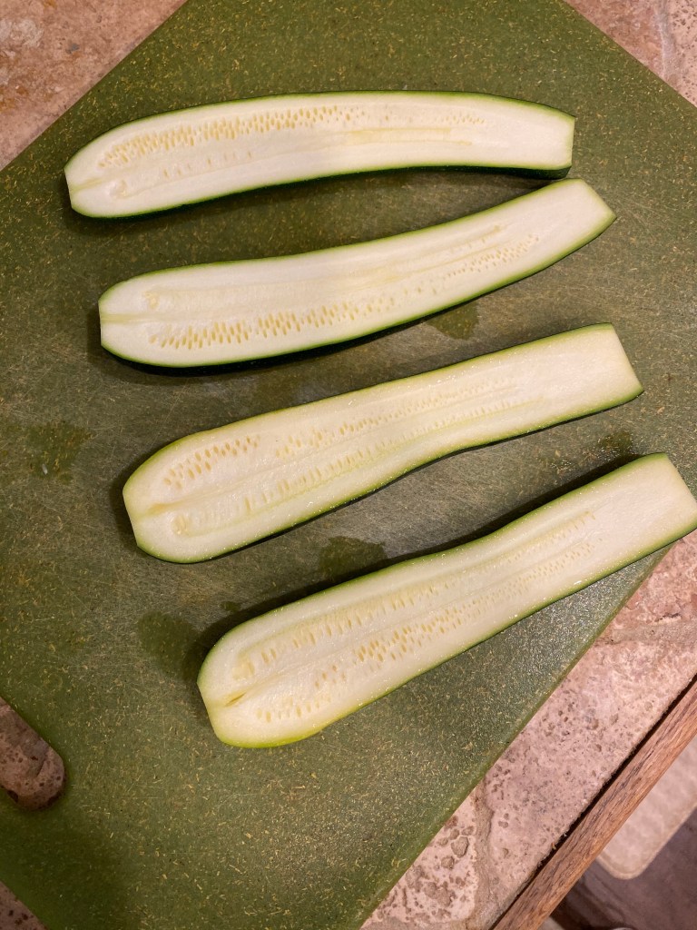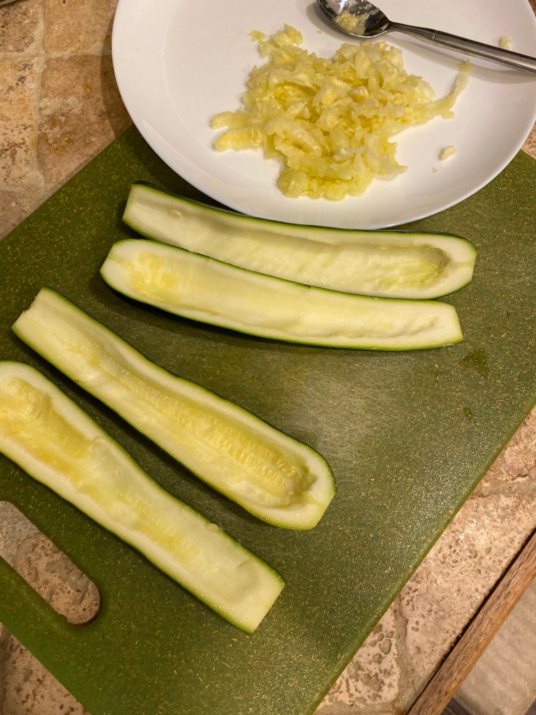 Simply use a spoon to scoop out the seeds from the zucchinis, I did not discard the seeds and innards of the zukes, I kept them to use for a pesto later on.