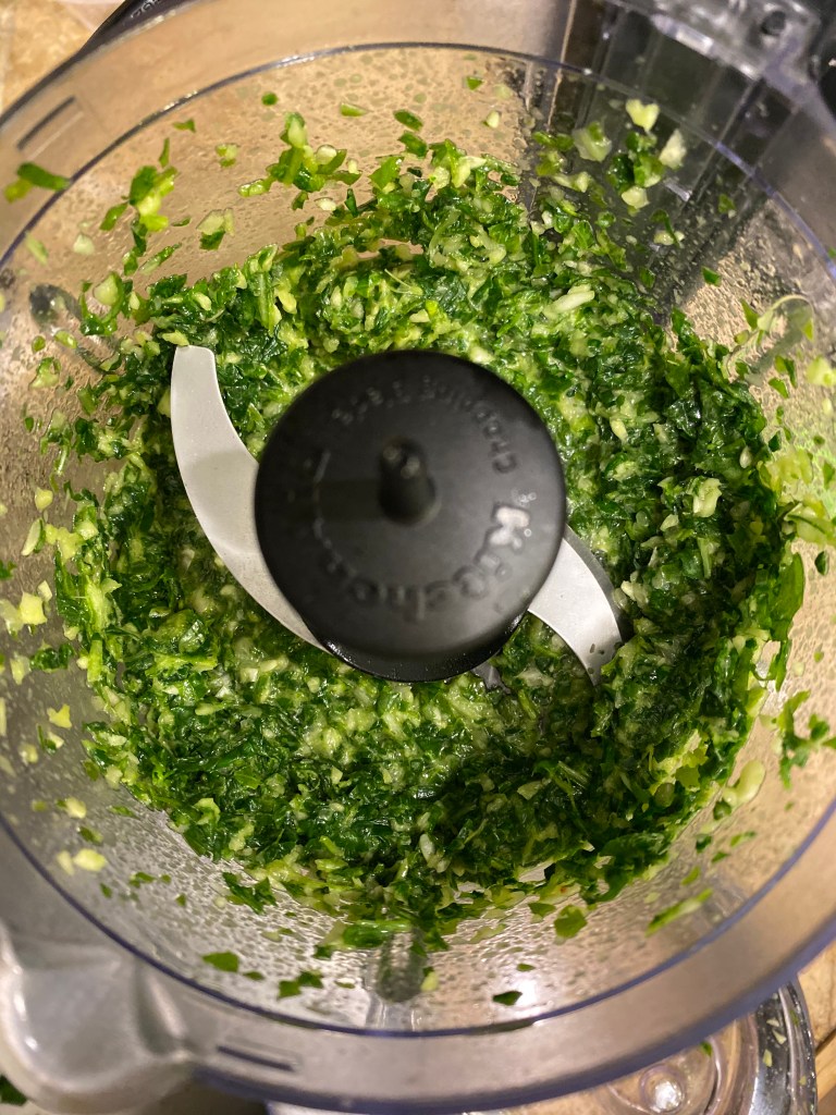 For the pesto, I used my food processor to chop up some basil, olive oil, pine nuts, some garlic, and my reserved zucchini seeds and insides that I did not want to waste. You do not need a lot of oil for this pesto because the added zucchini holds a lot of moisture.