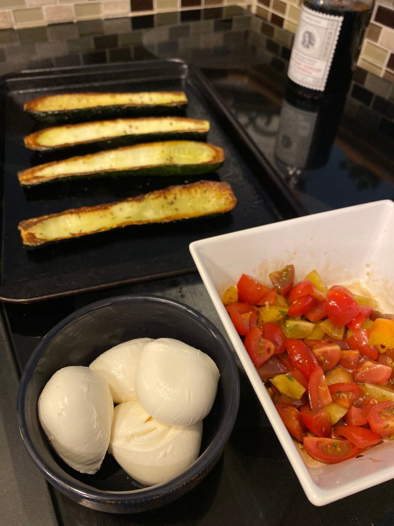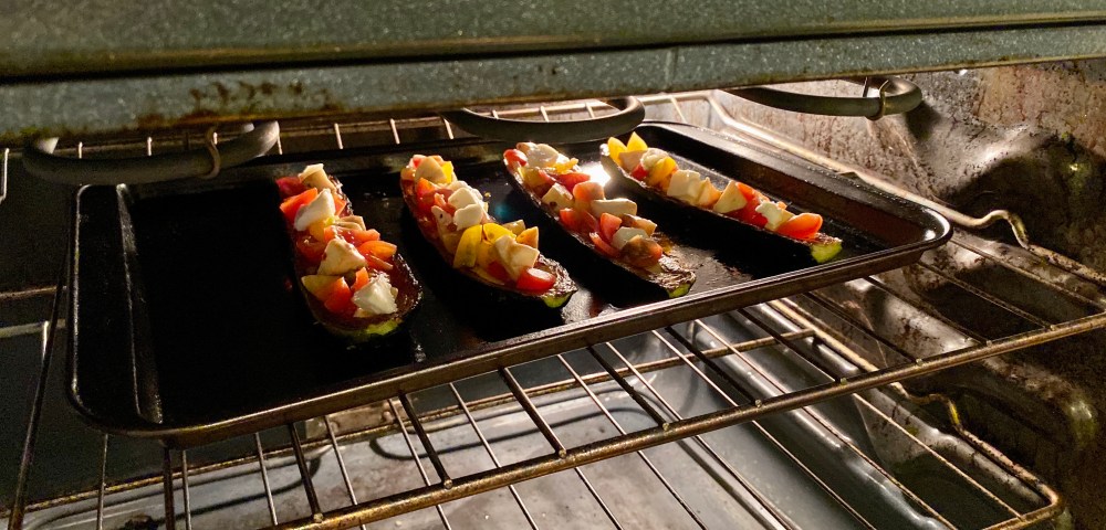Mix up your stuffing in a small bowl. Take our your roasted zukes and flip them over with their bellies up. Scoop a few tablespoons of your stuffing mixture into your roasted boats and bake a few minutes more to heat through. You can also broil to get a nice golden brown and melty cheese. Serve right away OR wait to finish heating your boats until after you have made a pesto pizza as a side dish like I did…