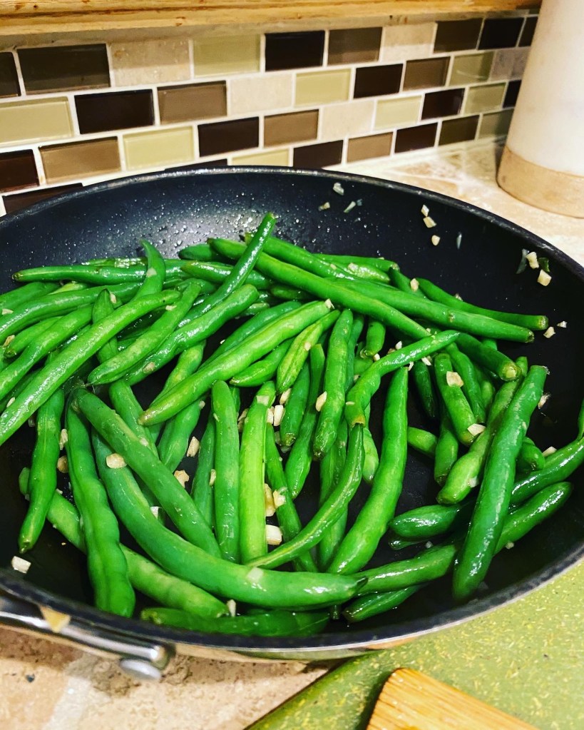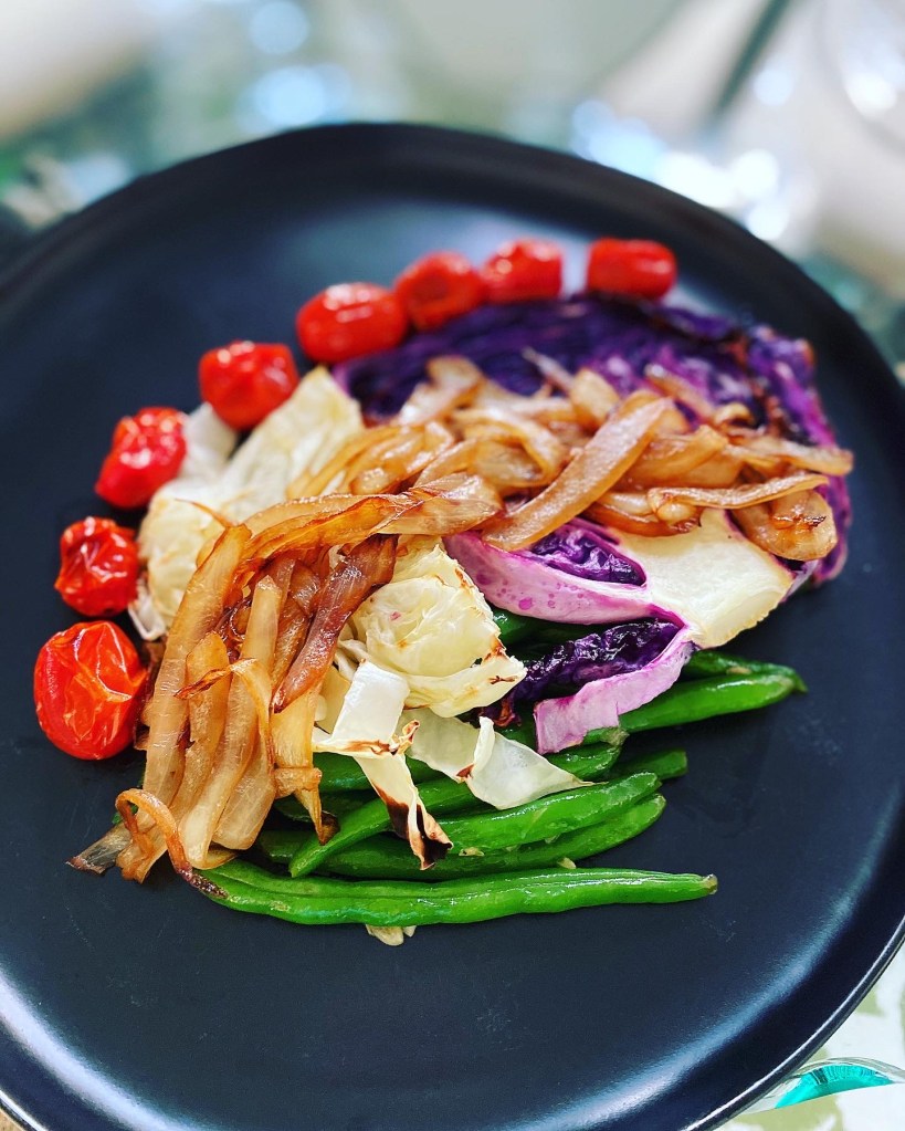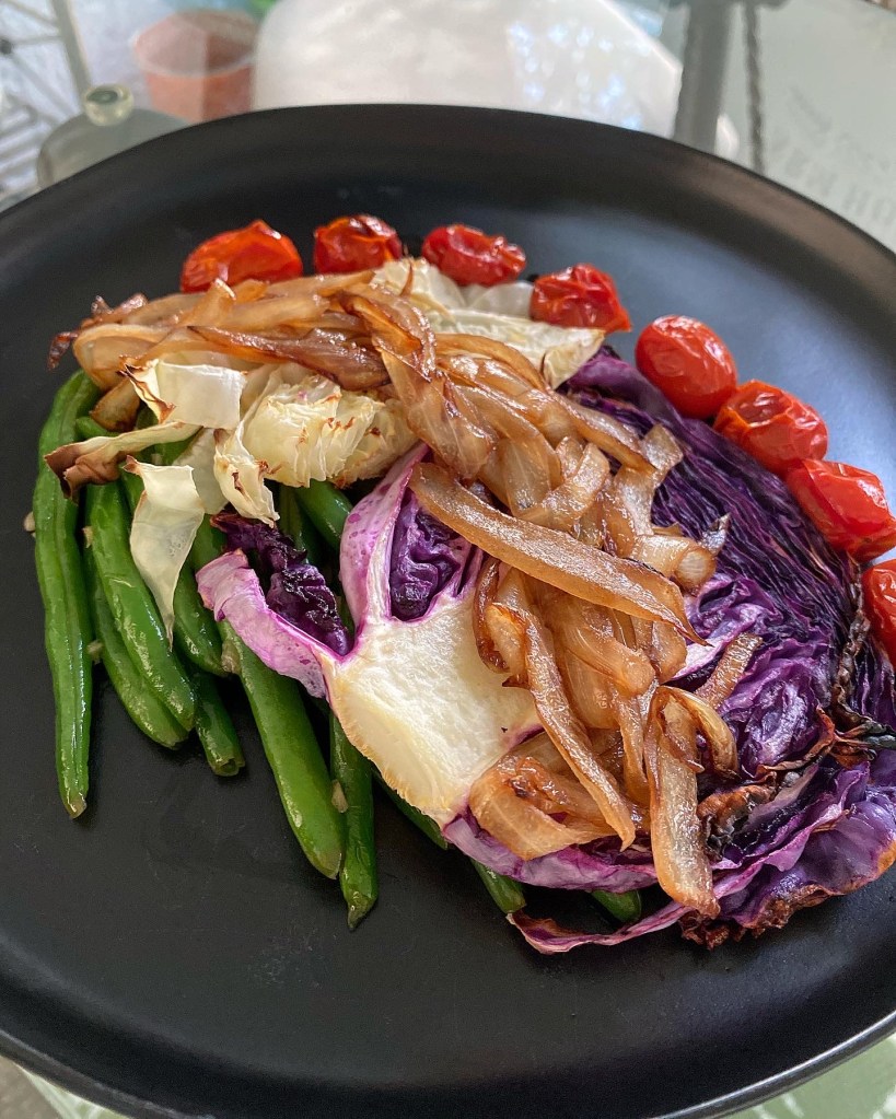 Another quarantine dish made was some roasted cabbage steaks. This dish did not make us miss protein at all. We go in waves of meat and no meat, not sure why…but we do. This is a new fav vegetarian meal for us. This was easy, delicious, quick, and beautiful! All I did was roast the cabbage and tomatoes with olive oil, salt, and pepper at 400 ° for 15-25 mins depending on thickness of your cuts until they are tender and tomatoes are slightly bursting. I topped the cabbage with caramelized onions (olive oil, salt, and balsamic vinegar, added water while they simmered so they did not burn) that I prepared while the vegetables were roasting, and then served my veggies with a side of VEGGIES! Sauteed green beans with garlic made this feel like a faux steak dinner dish. Loved every single bite of this pretty, pretty plate.