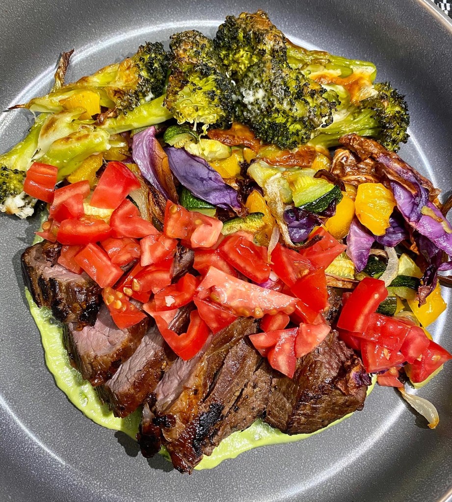I roasted broccoli, cabbage, bell pepper, zucchini, and onions. After they were roasted, I put pepper jack cheese on the broccoli and broiled to get nice and crispy. Then after browning the sirloin on all sides until cooked through, I just topped the steak with fresh tomatoes and served the dish over an avocado crema that was out of this world. For the avocado crema, I used the food processor to blend get this, avocado…champagne vinegar, garlic, olive oil, salt, and some filtered water to thin it out. I love champagne vinegar…That’s it! I used one cast-iron skillet, my food processor, and a baking sheet. Easy peasy!