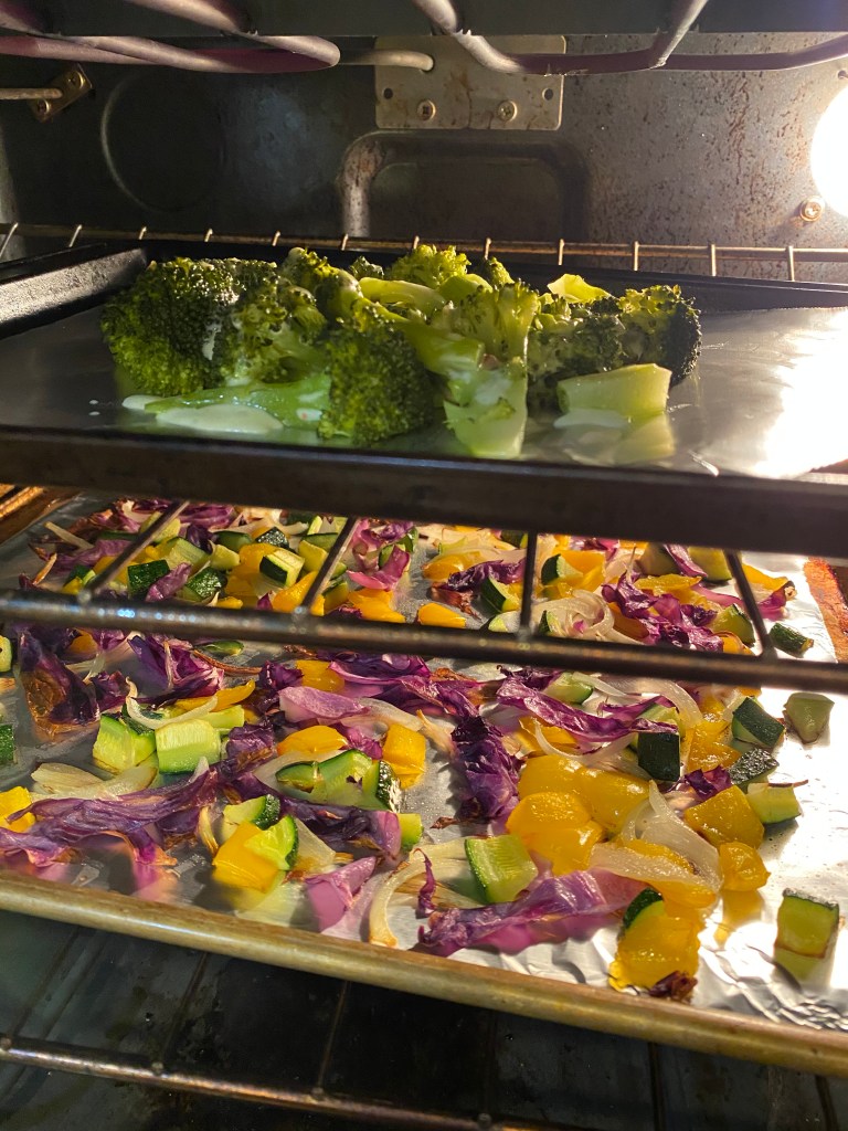 Remember when I said we go in waves of meat and no meat? Here we had some sirloin steak from the freezer that was defrosted to make this quick and easy cleanup dish. I like to marinade defrosted steaks for taste purposes, this one was just a store-bought marinade that I enjoy. I defrosted the steak, then marinaded for 30 mins or so. While I preheated my oven for the vegetables (again my veggie surplus clean out) I kept the marinating steak on the counter to come to room temperature before I cooked them.