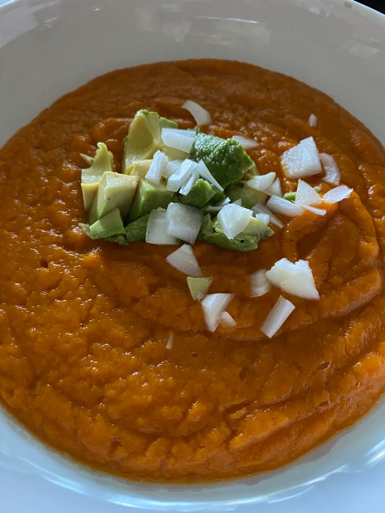 I also love to make soups. My husband likes chunky soups. So I chop everything up in larger pieces and either crock-pot or simmer on the stove. I prefer more creamy soups so I roast anything with olive oil, salt, and pepper then throw it in a blender with stock. I like the creamy consistency but I will also add hunks of avocado or other veggies, rice, beans, crunchy tortillas, and other items like that to make it more of a MEAL vs a great side dish to a veggie sandwich which is also pictured.