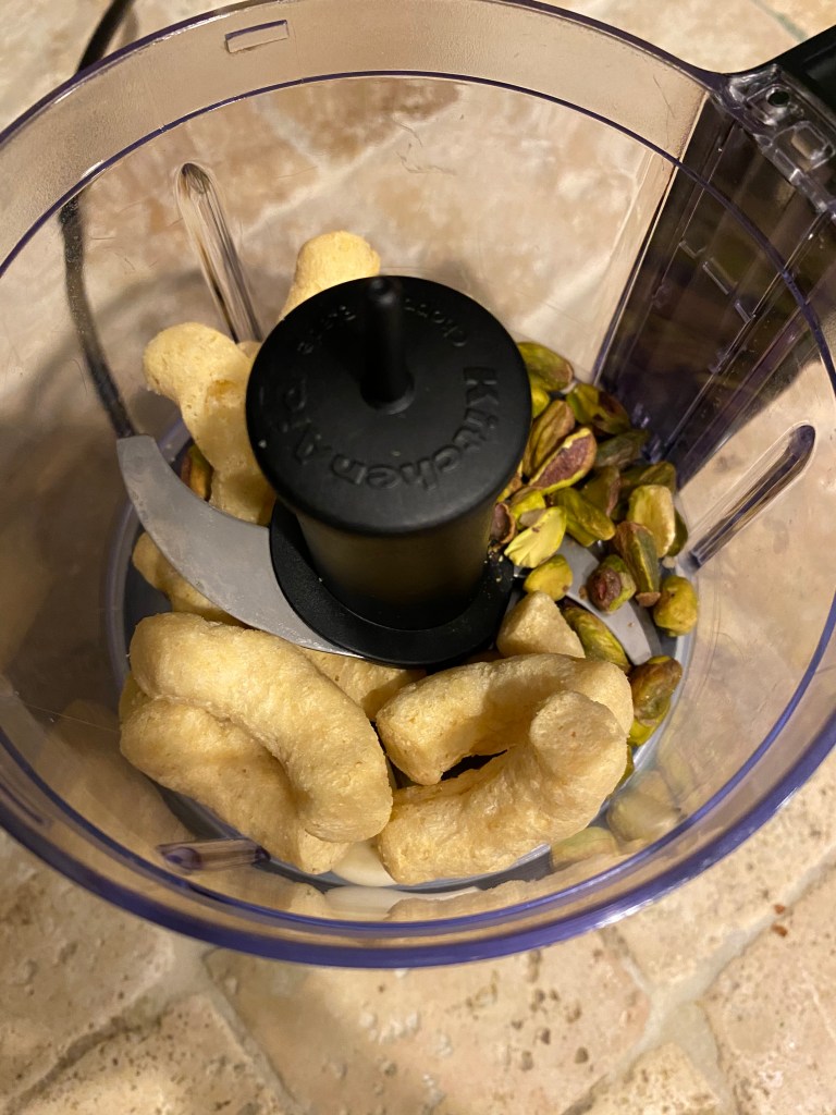 I used a food processor to make my crust and pulsed together the hippeas snacks, pistachios, and a clove of garlic. I baked my salmon filets in the oven until they were ALMOST cooked through. On the stovetop I melted a tablespoon of butter and added the hippeas crust to get buttered up and delicious. I put the crust on top of the salmon and then broiled it to perfection. OMG, a new favorite “breadcrumb” for us.