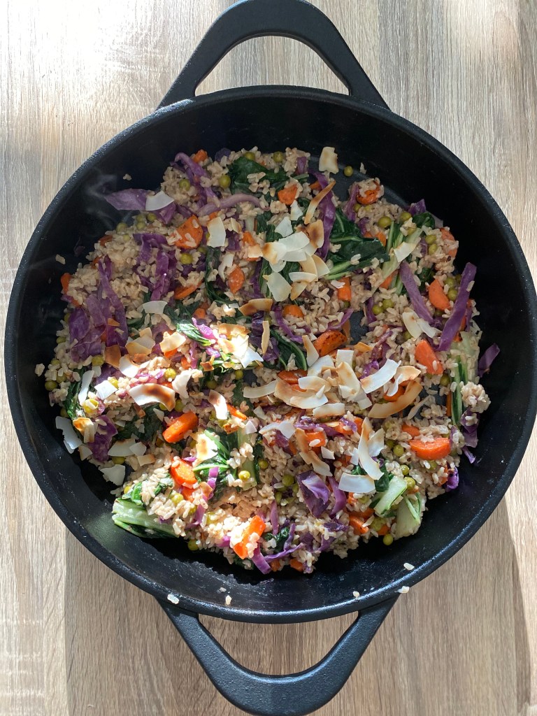 Pictured on the left was my husband’s dish he created. I was so impressed! The basket ingredients I had for him were coconut flakes, raw almond butter, ginger, and long grain brown rice. What a masterpiece he made!! His dish was so simple as well. My husband cooked the rice as the package said and made an almond butter, coconut fried rice. As the brown rice cooked, he sauteed carrots, bok choy, cabbage, and peas in some olive oil and a little salt. He removed the veggies from the pan and then added some more oil, sauteed minced ginger and fried up the rice a bit. He then added all veggies in. In a separate bowl, he mixed almond butter, more minced ginger, sesame oil, and little water to make a thin sauce. He tossed some with the fried rice and topped with toasted coconut flakes. We spooned some more sauce over a plates with some crushed red pepper. I WISH you could smell the dish he made, it was amazing to look at, smell, and eat! He definitely would have made it to the next round of “Chopped!”