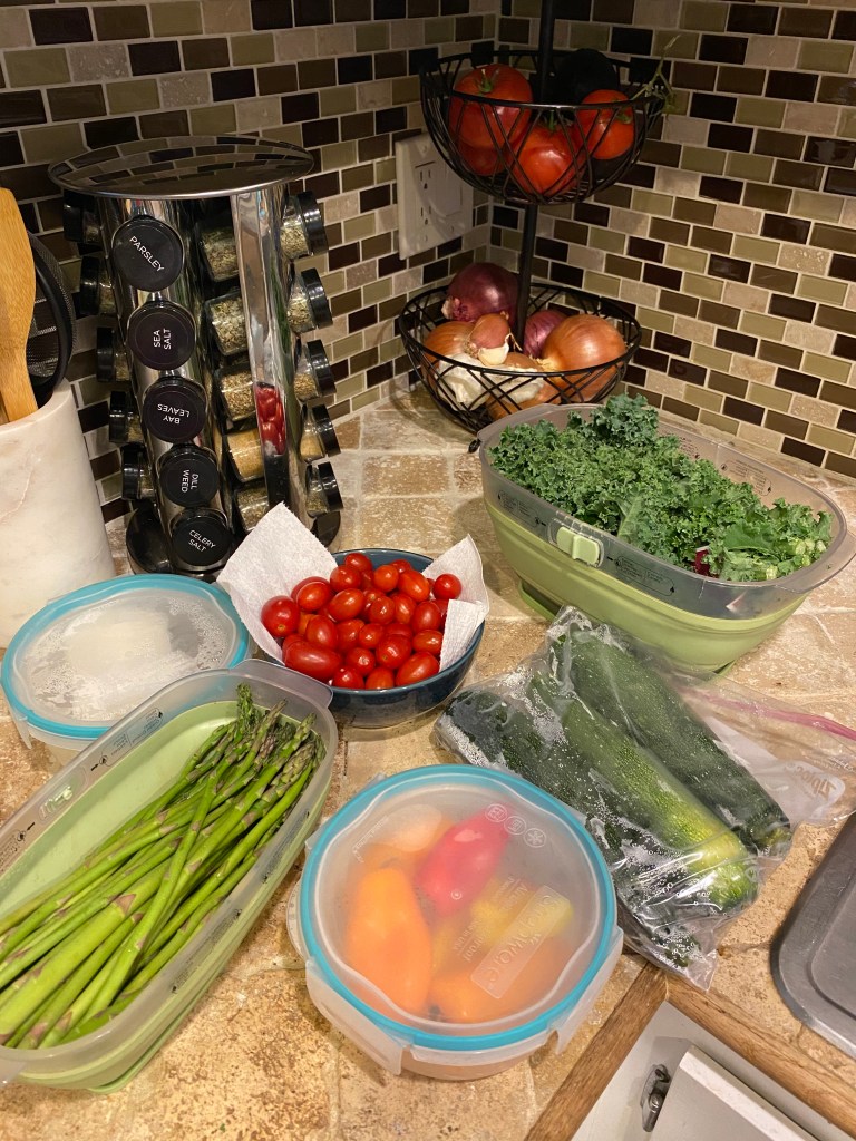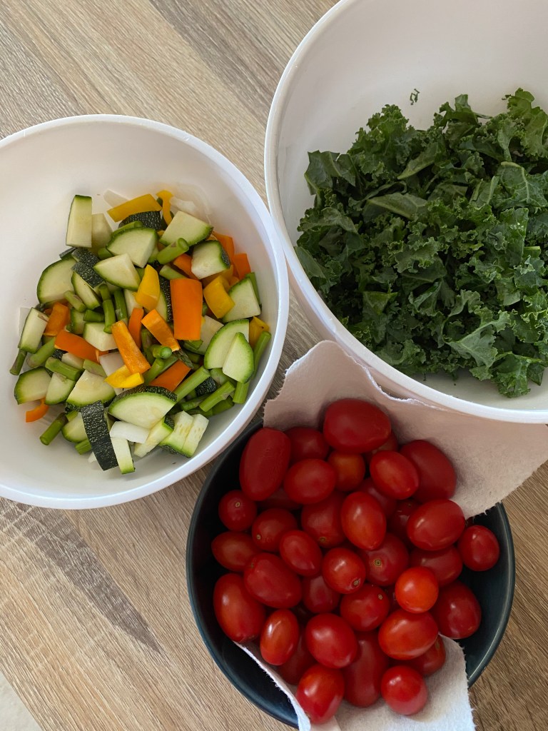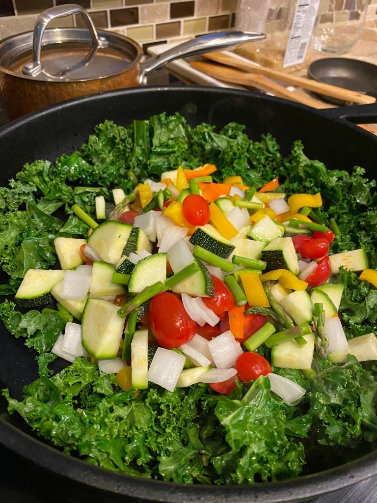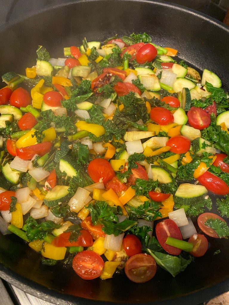 Kale, Zucchini, Cherry Tomatoes, Onion, Bell Pepper, and Asparagus