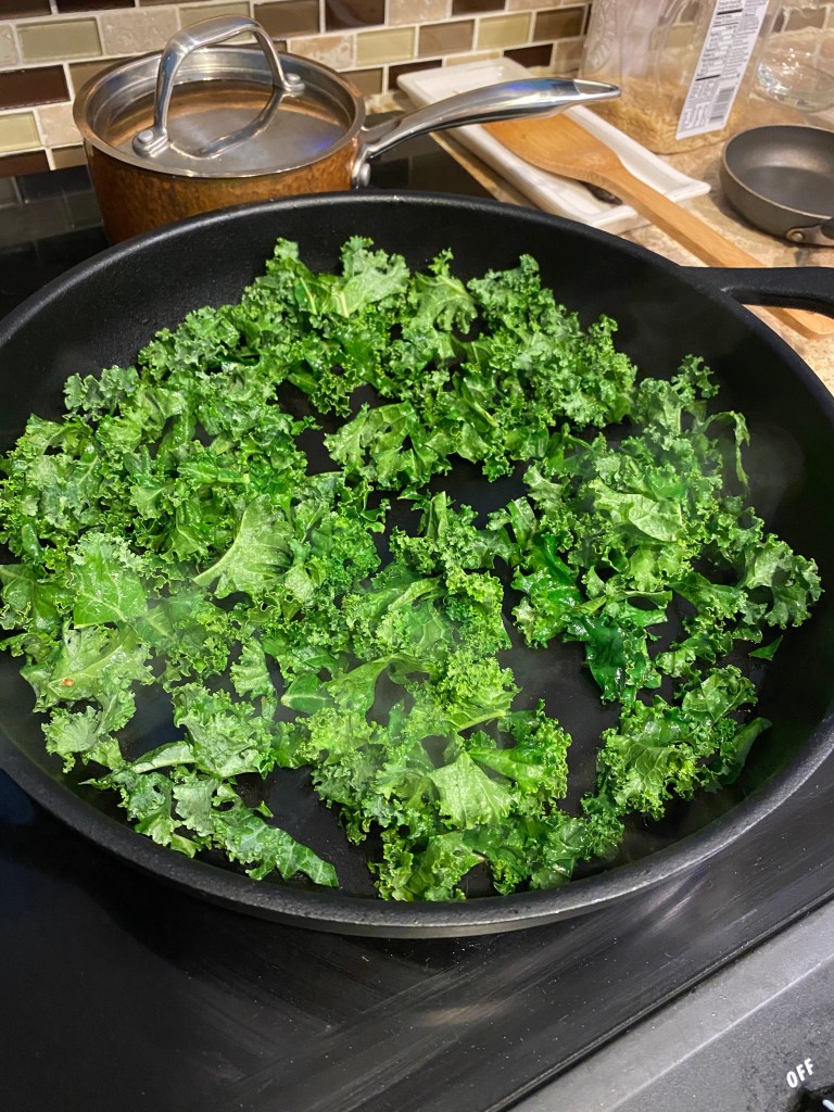 Use the same pan so you get the yummy pieces and bits from the chicken sausage, it’s surprisingly not greasy. Probably because I cooked the chicken to oblivion and the grease evaporated…brown food/burned (LOL) food tastes good.