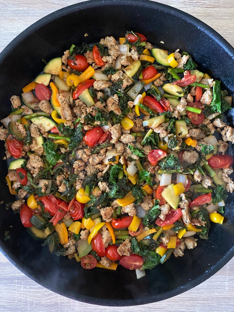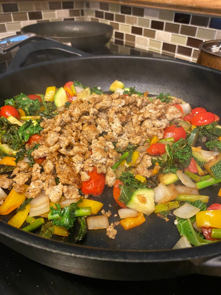 When the vegetables were to my desired tenderness I added back the chicken sausage and tossed them to mix and heat through.