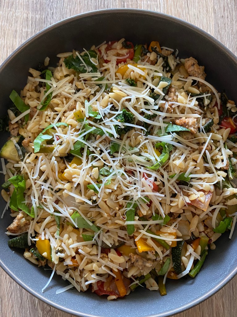 Once the orzo was coated with the olive oil and garlic amazingness, I poured the orzo into the cast iron skillet with the veggie and sausage mixture, topped with fresh basil and parmesan, took a picture (or 100), and then hoovered it!
