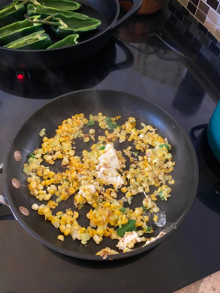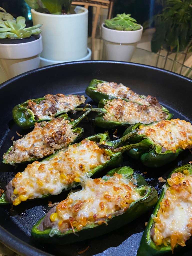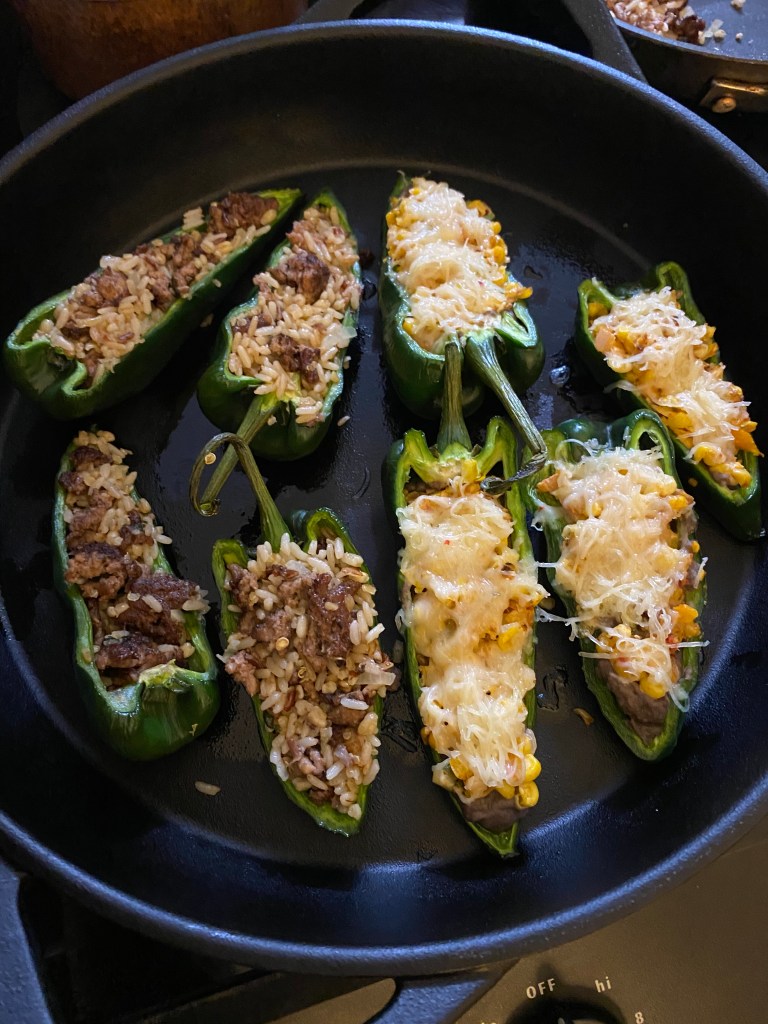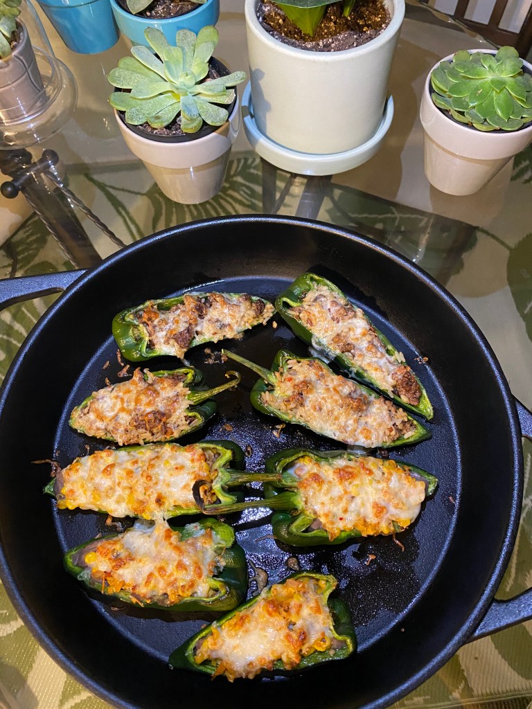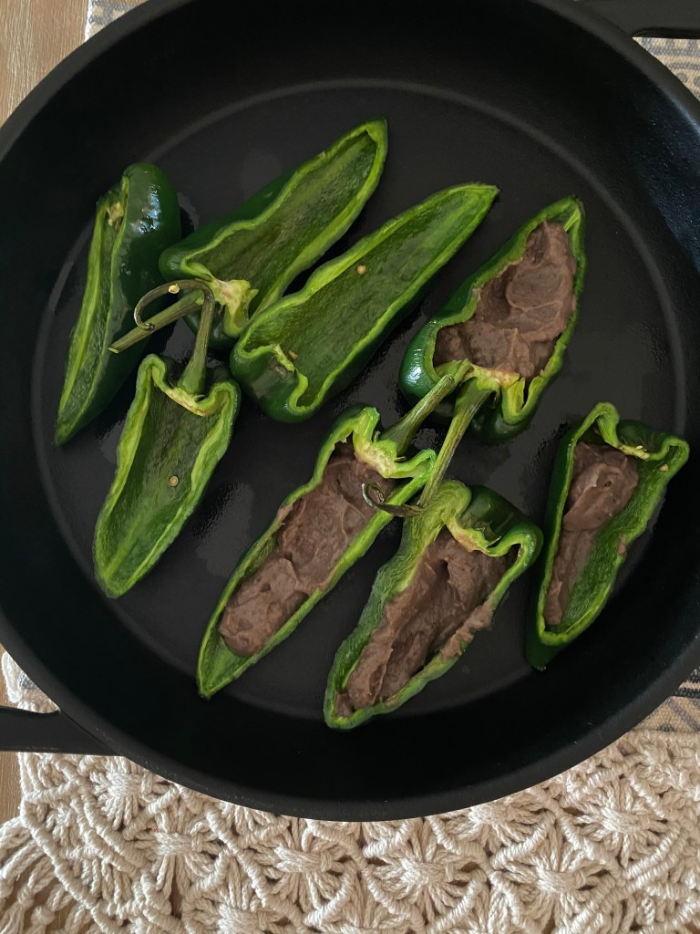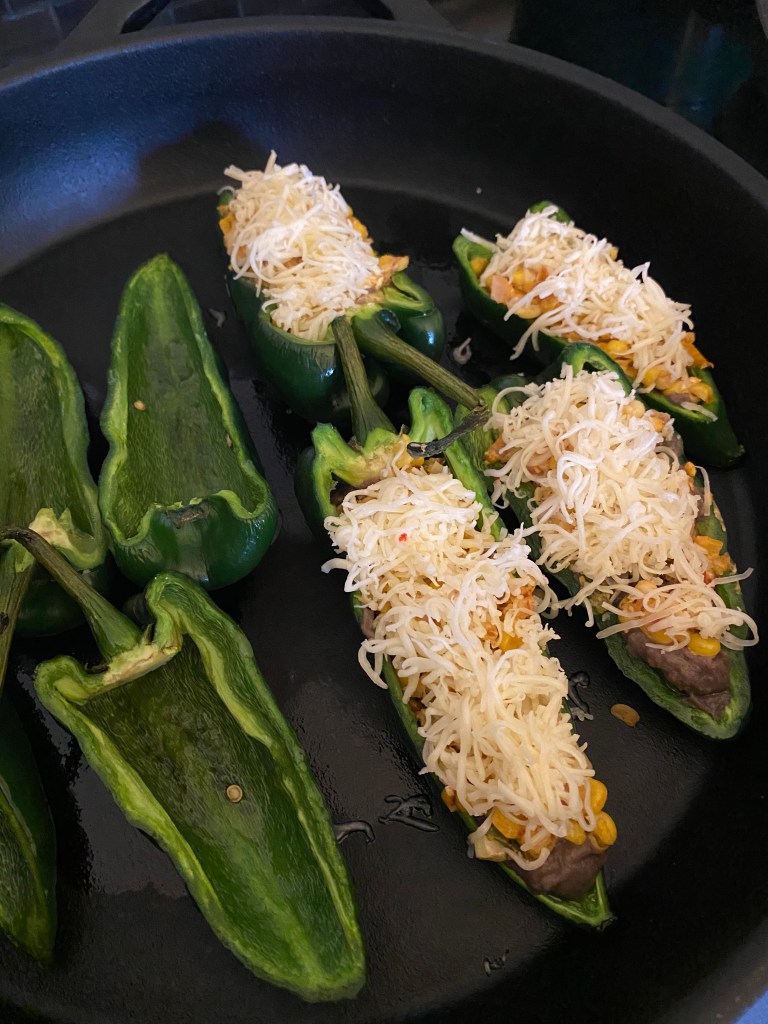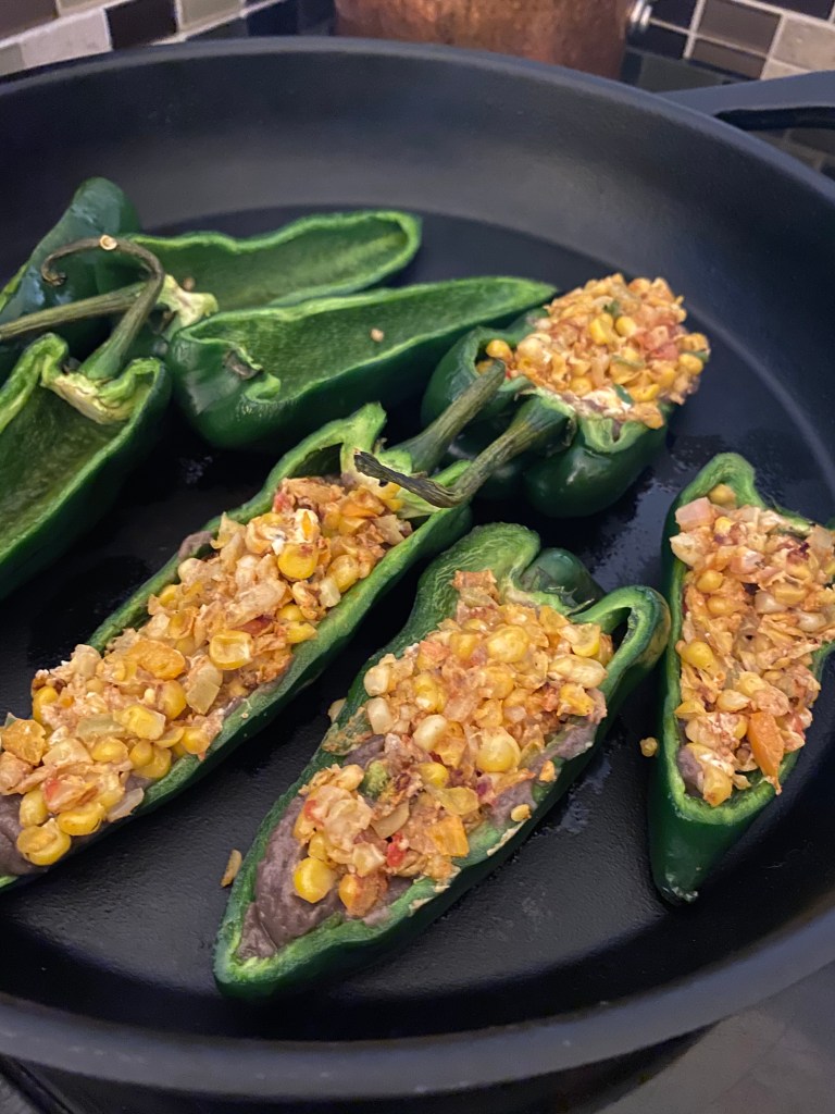 After that, I quickly cleaned my mess up, and tagged my husband up next. Once he made his stuffing, stuffed his poblanos, and cleaned up his mess, We put the skillet back into the 400° oven for another 10 mins or so.