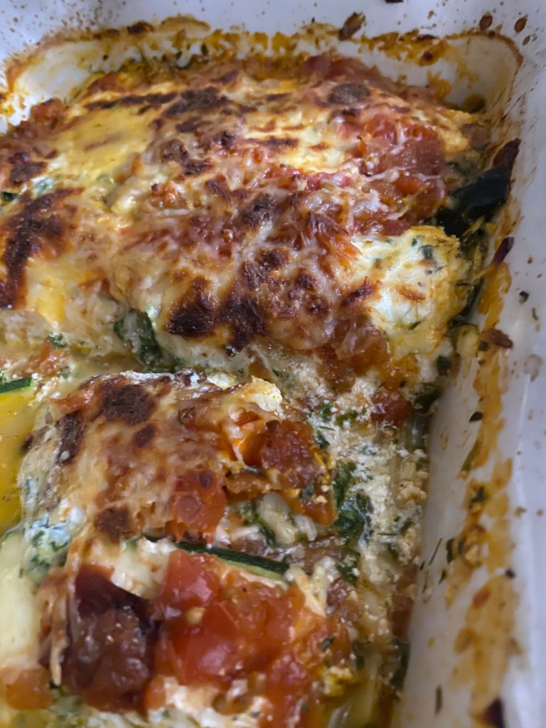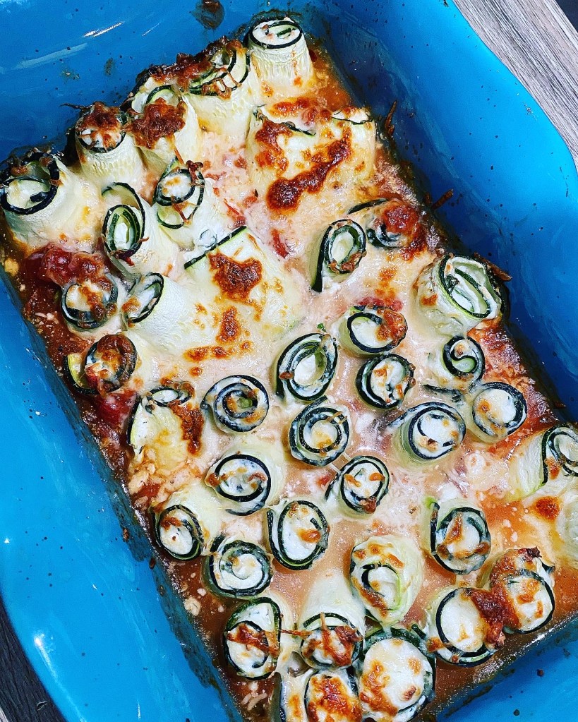 I made the chicken in advance the day before so it was cooled down and easier to work with. No use burning your fingers to roll up zucchini. It’s good to make this in advance as well, so all the flavors can really marinate and be happy together.