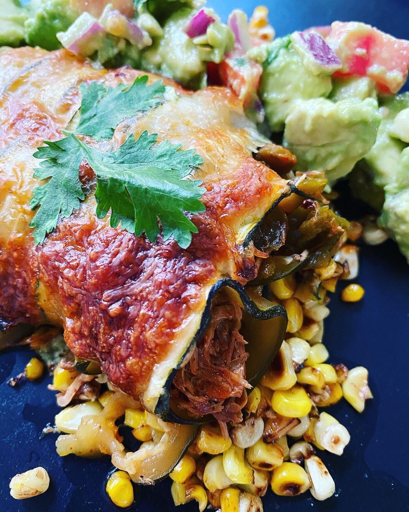 To assemble the zucchini enchiladas, I used my handy-dandy mandolin to thinly slice my zucchini lengthwise. I laid four slices next to each other, slightly overlapping to create a tortilla effect. Sprinkled with a pinch of salt and then scooped my shredded chicken onto the zucchini and rolled ’em up.