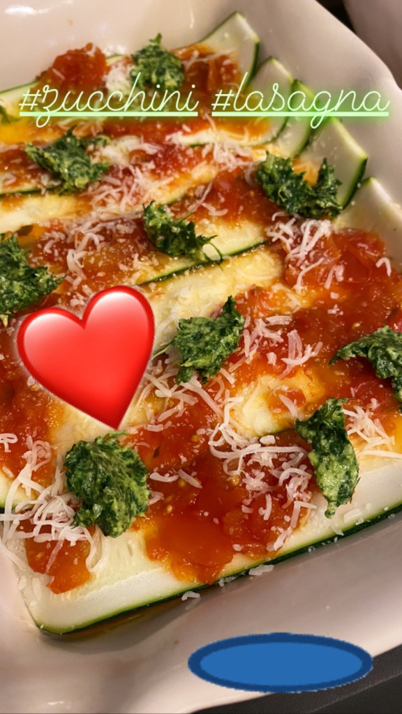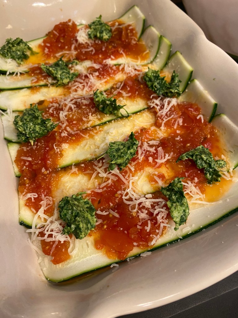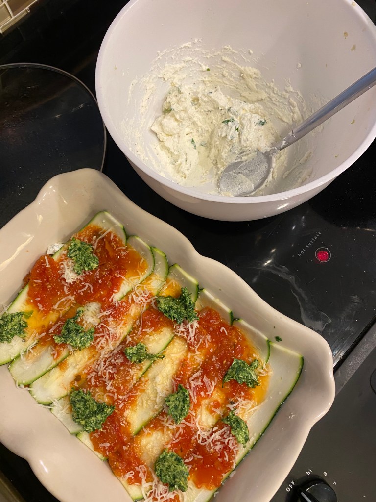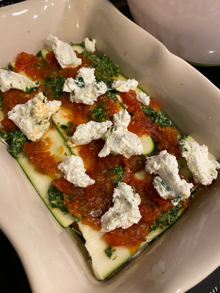 While the oven preheats, begin assembling your lasagna in a 13 x 9 baking dish. I did a ladle of tomato marinara on the bottom, added a layer of zucchini “noodles” and some dollops of the ricotta mixture.