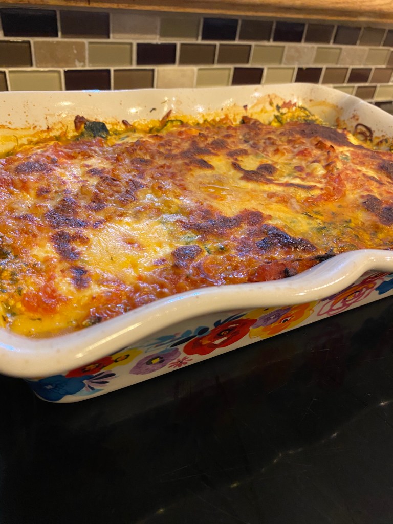 Bake until golden brown. We cooked ours around 40 minutes and then let the lasagna rest before digging in. Remember, zucchini is really moist so letting the dish rest is very important so you don’t have a super runny meal!