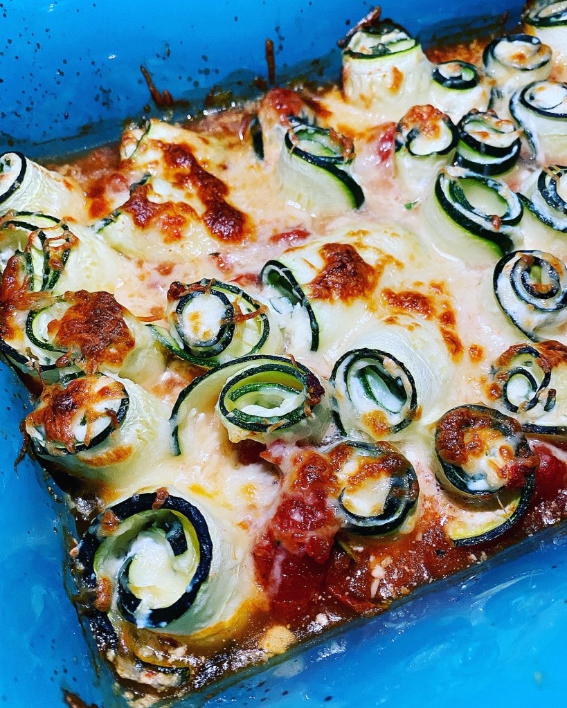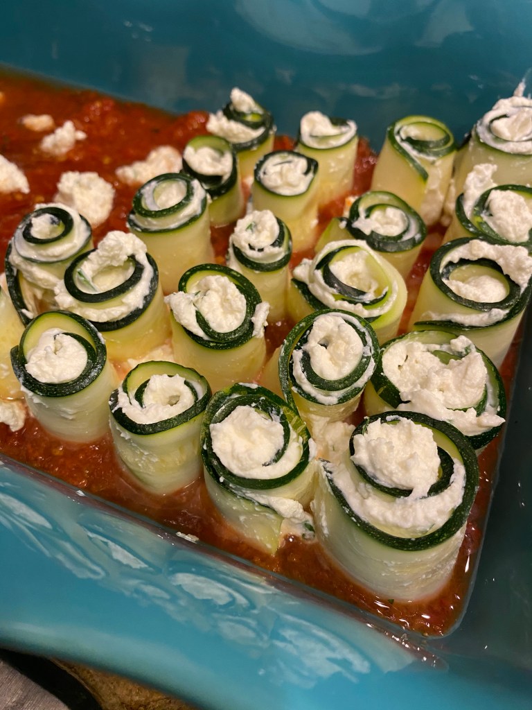 Working one at a time, simply put a spoonful of the cheese mixture onto the zucchini slice and roll. Add to the baking dish as you go until it is full. Top with more mozzarella and bake until bubbly and golden, around 30 mins. Serve with more of your marinara and your favorite side! We ate ours with fettuccini alfredo since I was craving alfredo sauce.