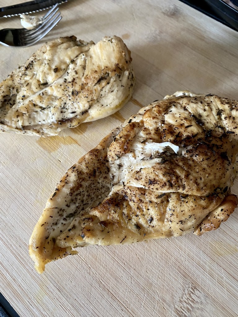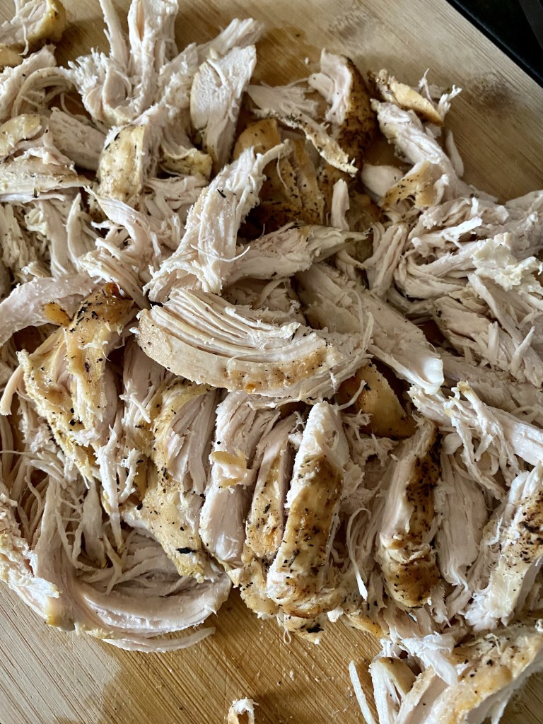 For my cooked chicken, I used the slow cooker. I like to batch cook more than I need so I have extra chicken for the week. In a HOT cast iron pan, I seared the chicken on all sides using olive oil, salt, pepper, and some of the thyme. Once browned on all sides, I simply added it to the slow cooker on low for 4-6 hours in some chicken broth. You can easily make the chicken in advance and use at your leisure. Or skip this step altogether, save some time, and buy a rotisserie chicken as well! Whatever works!