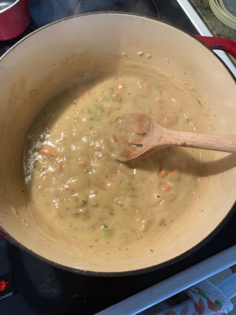 Next, in my dutch oven I sautéed the carrots, celery, and onion (mirepoix) until tender in a large drizzle of olive oil over medium heat. I added in the thyme, salt, and some pepper. When tender (about 7-10 mins) I added the butter until melted and then the flour. Mix well and evenly for a minute or two in order to cook down the flavor of the flour. Then I slowly added my liquids, the milk and chicken broth. For added flavor, I saved the chicken juices/broth from the slow cooker and used that!