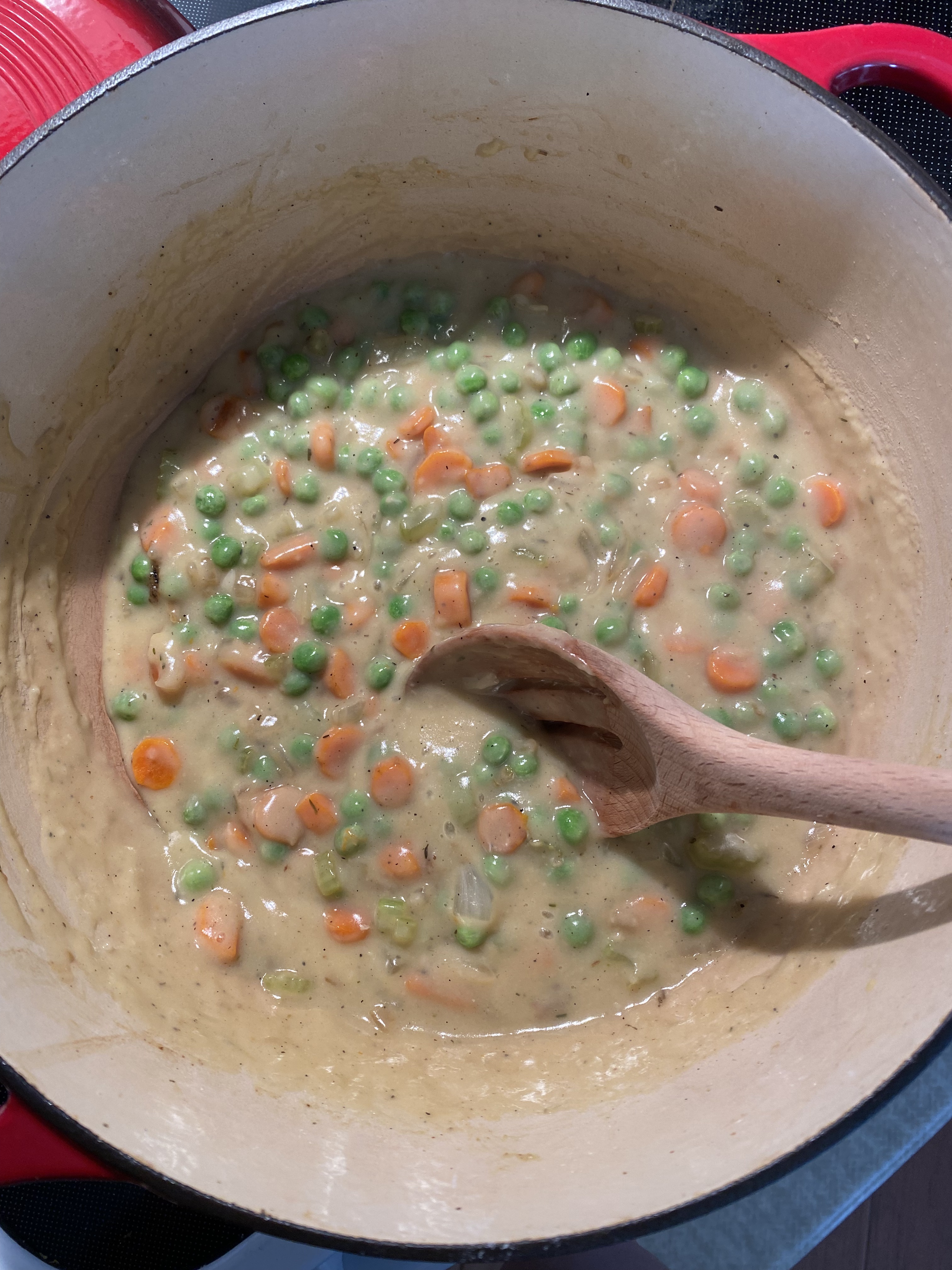 I continued stirring until thick and bubbly. This happens quickly! Don’t leave your pot. Depending on how “gooey” you want your chicken pot pie, you can easily add more butter, flour, and liquid. This is my favorite part of the pot pie.