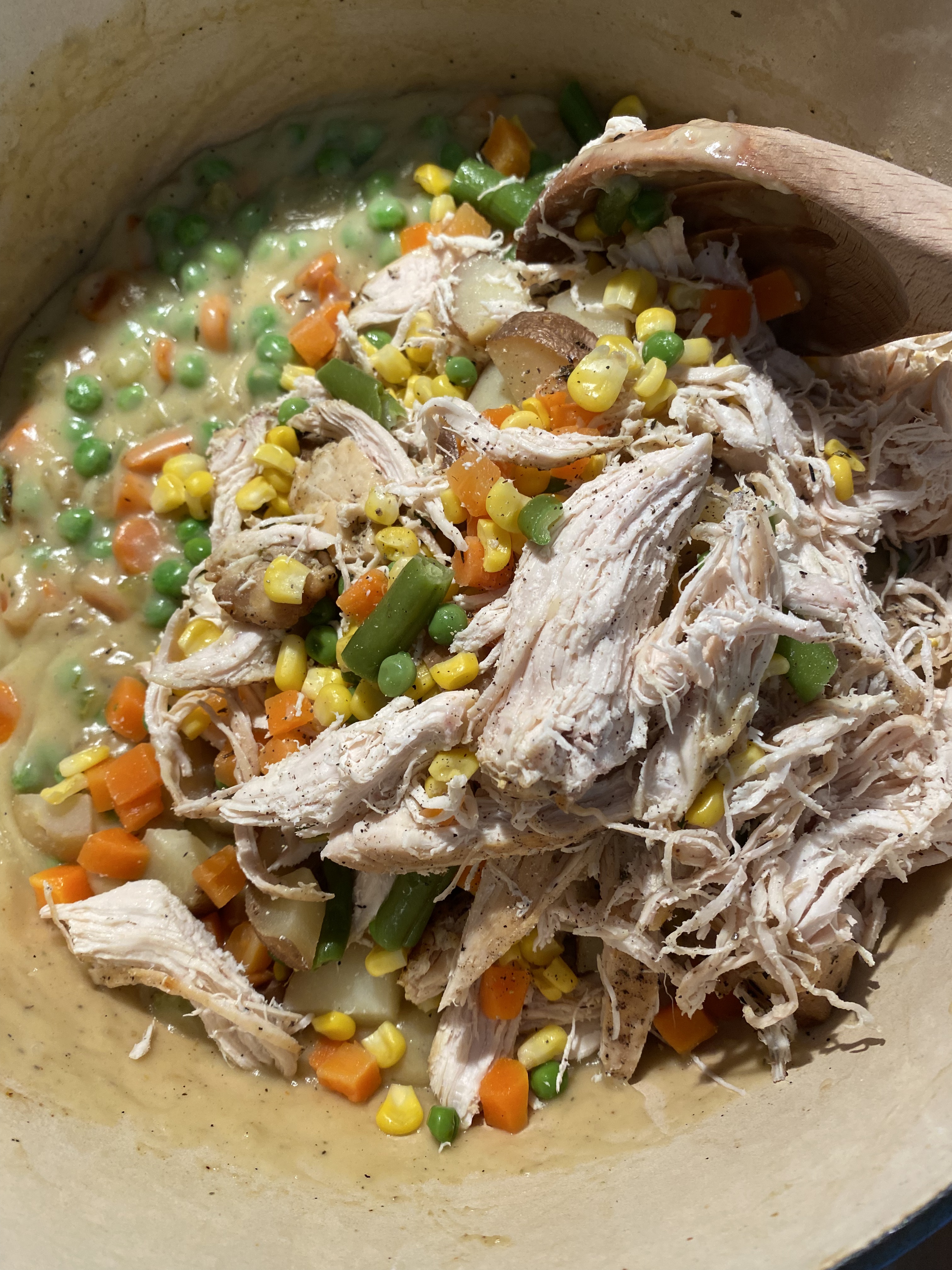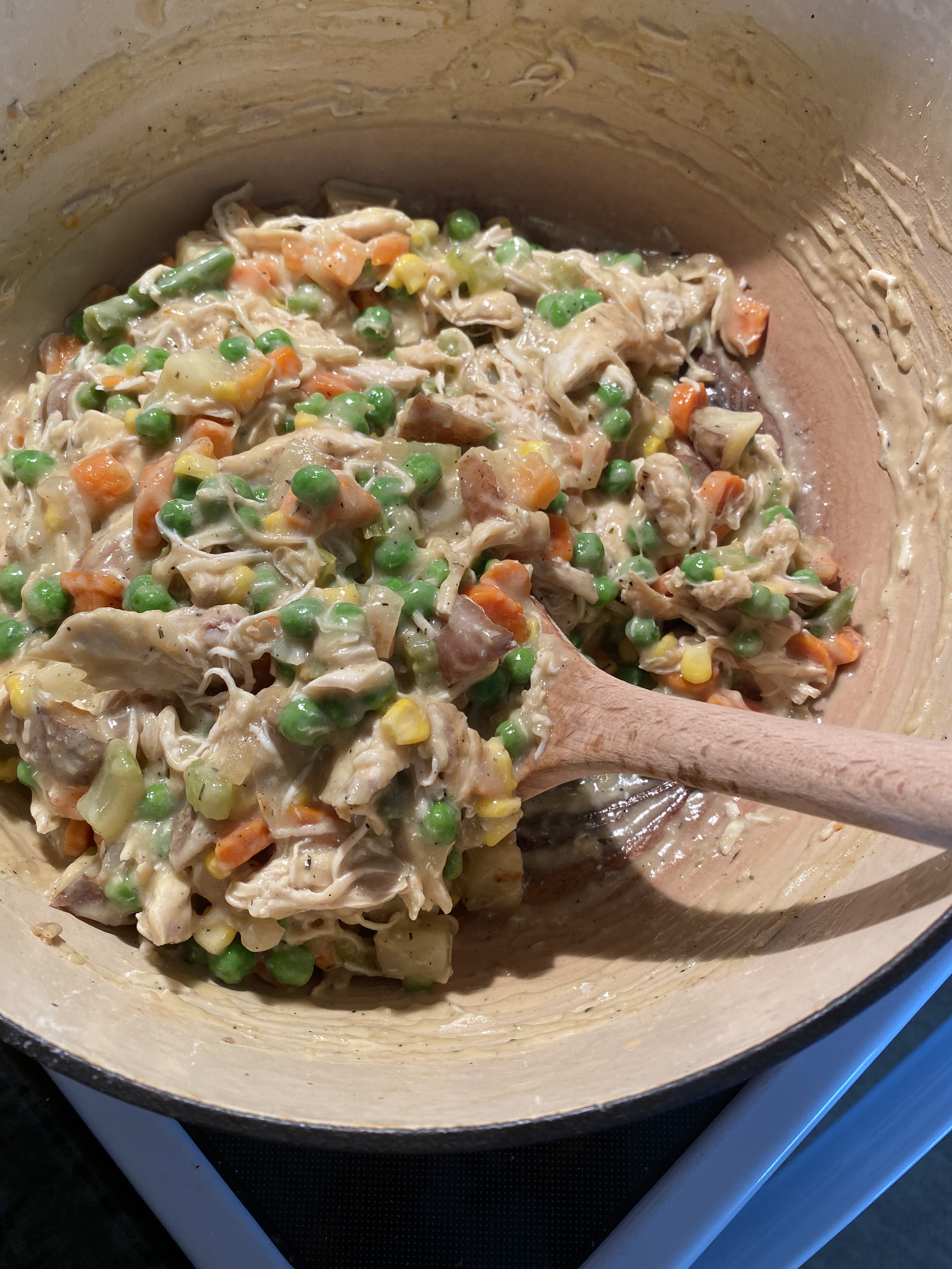 Once my sauce was thickened, I added the rest of my veggies to the mirepoix. For me, I had remnants of leftover vegetables from the “steam in bag” side dishes and some baby roasted potatoes that I quartered. I used a mixed veggie, as well as, peas. Use whatever you have on hand. Whether it be fresh, frozen, or canned, it all taste delicious under some crust!