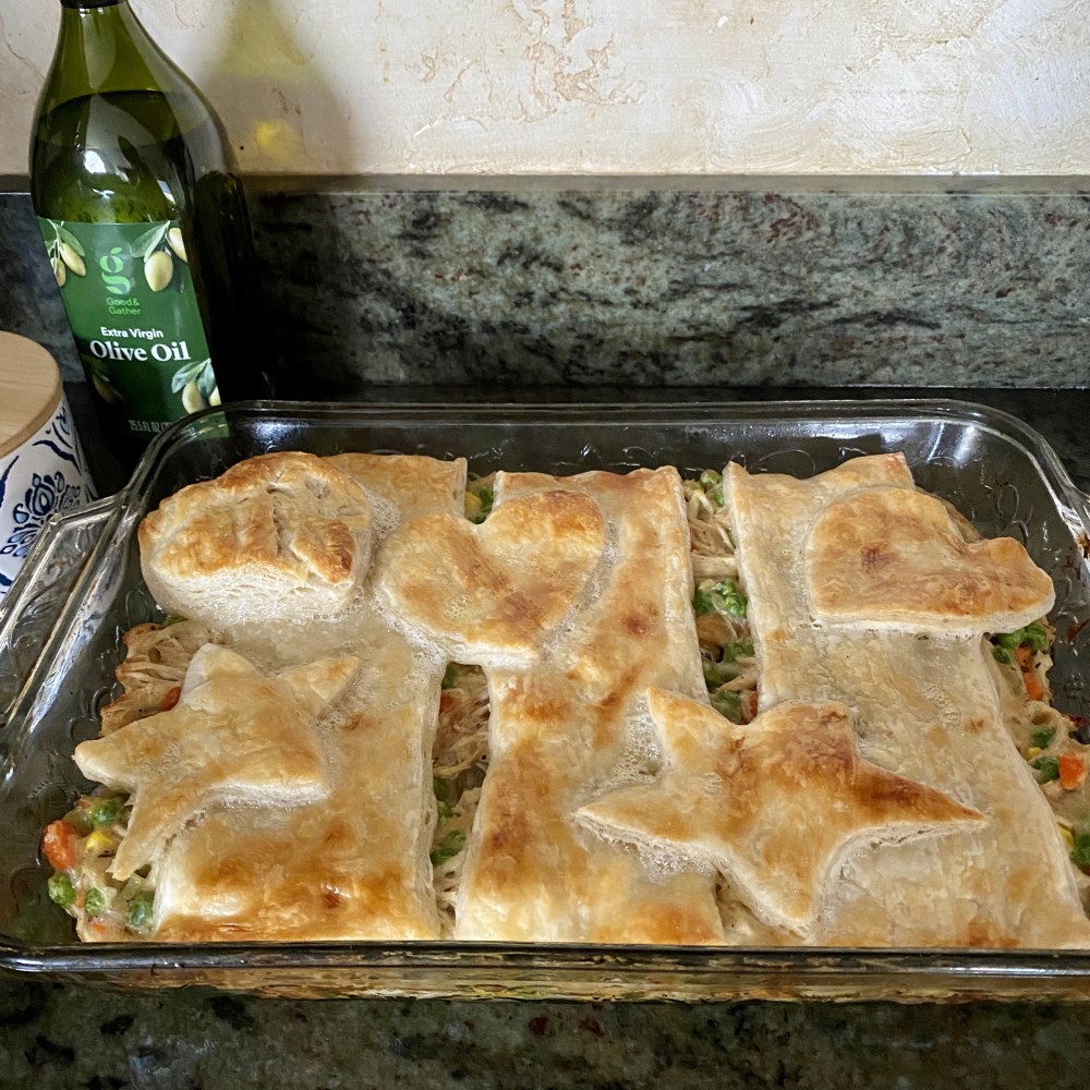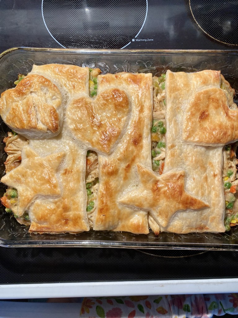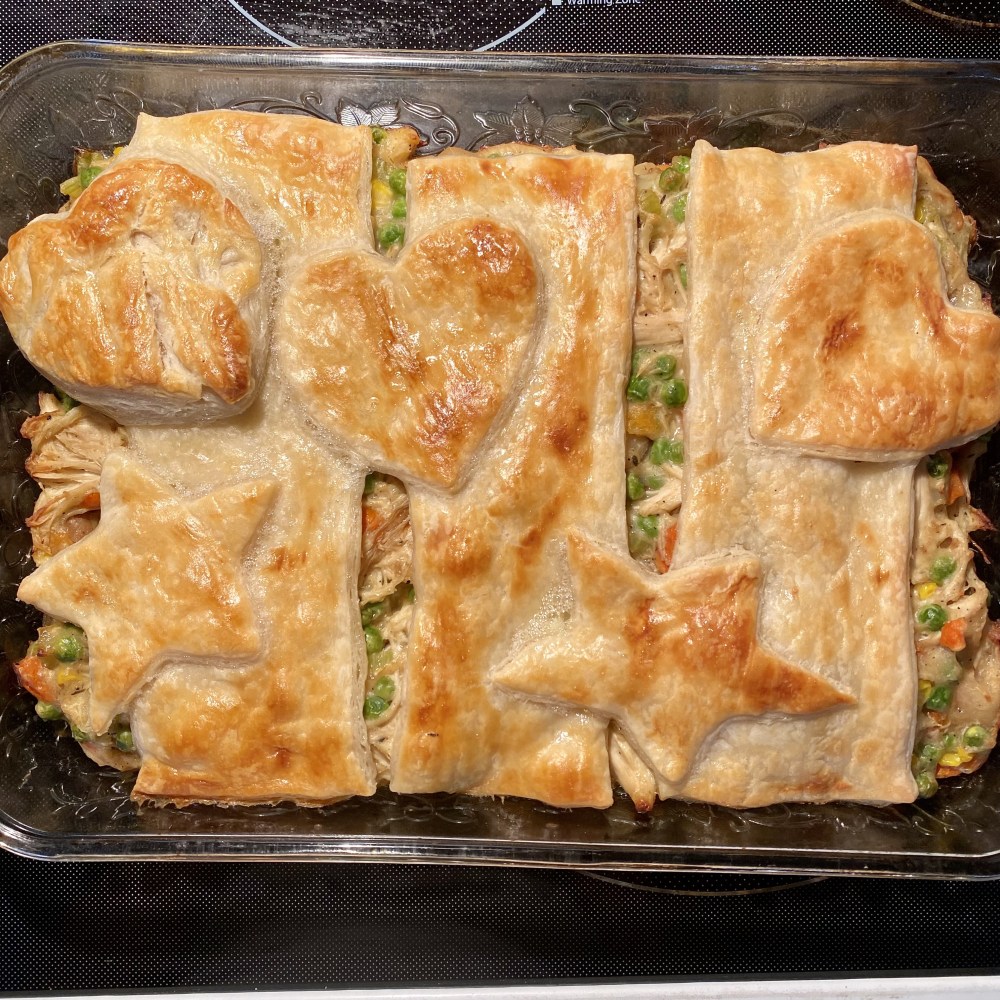 You can use any store bought dough, pie crust, biscuits, mashed potatoes, or whatever you can dream of to top your pie. I personally just love puff pastry. You can also add an egg wash to make it nice and golden and to keep it crunchy…especially for leftovers.